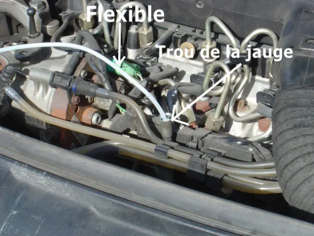 - Plongez le flexible dans le carter par le trou de la jauge.
